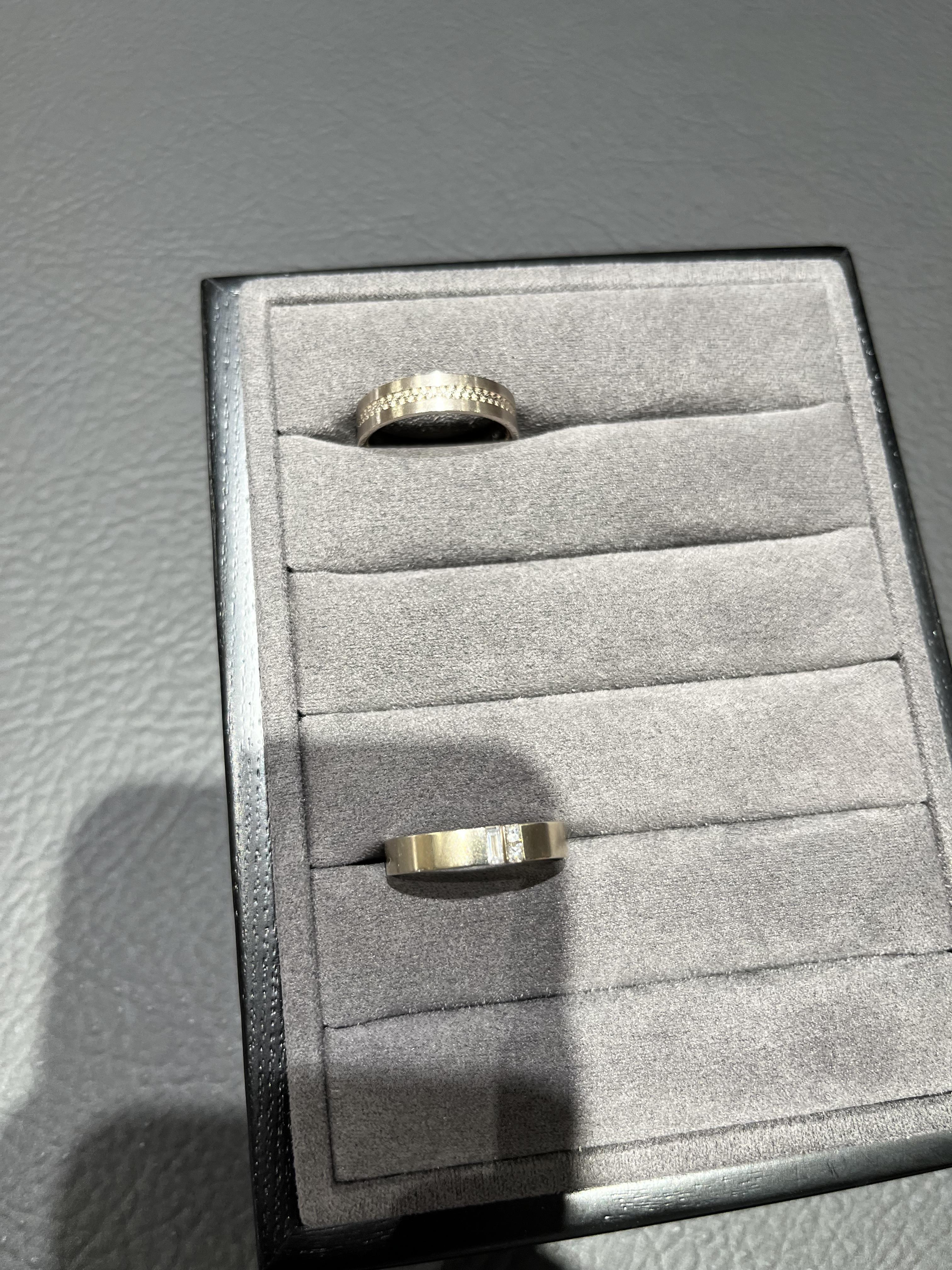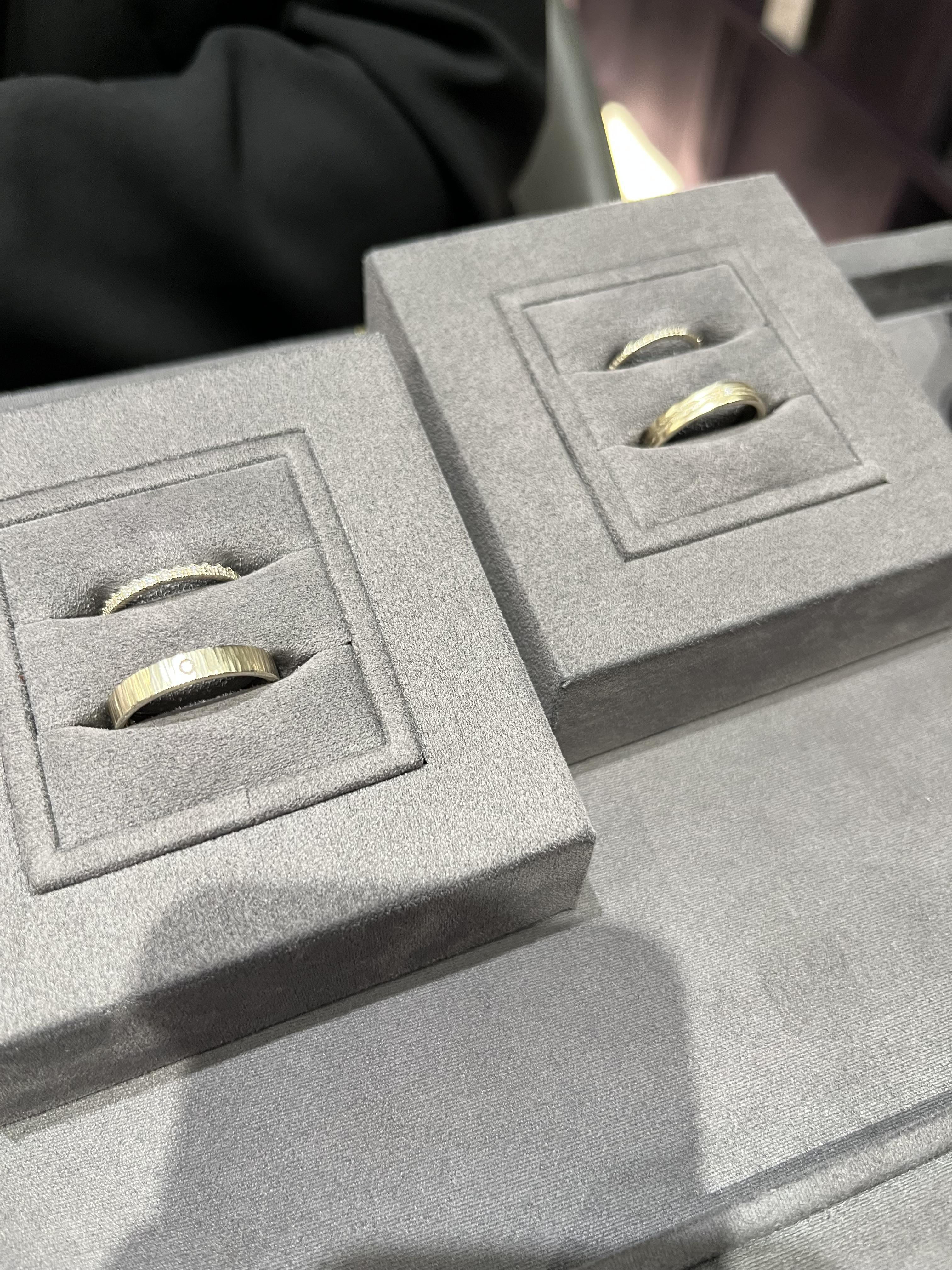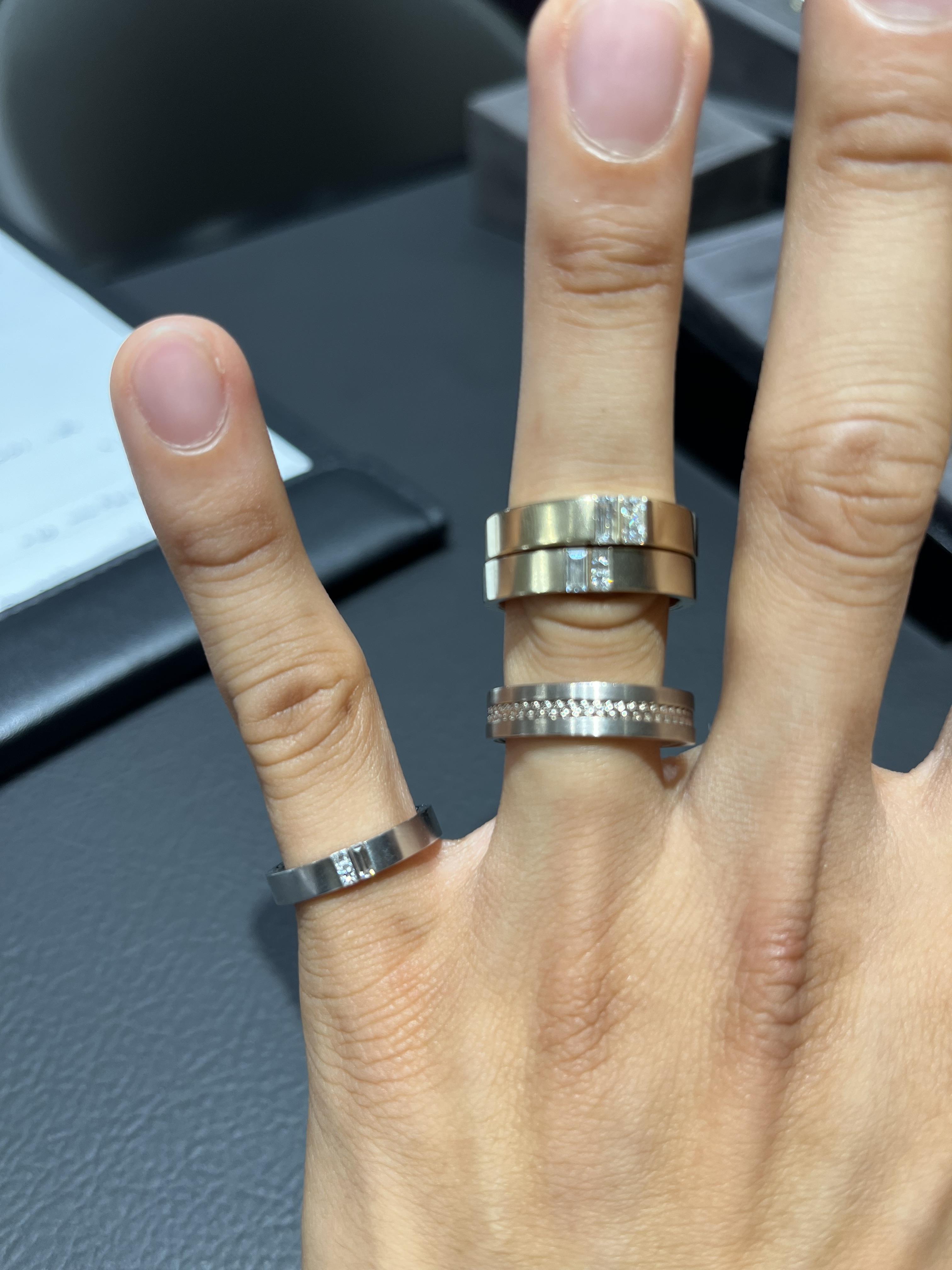 점장님께서 직접 상담을 해 주셨다. 누니의 많은 라인을 직접 볼수 있었는데 결정하기 어려운 우리를 위해 이상형 월드컵 느낌으로 반지투어를 진행시켜 주셨다. 온라인으로만 보다가 직접 착용해 보니 온라인에서는 별로였던 라인이 예뻐보기이기도 했고 또 온라인에서는 예쁜 라인이 착용해 보니 별로이기도 했다.