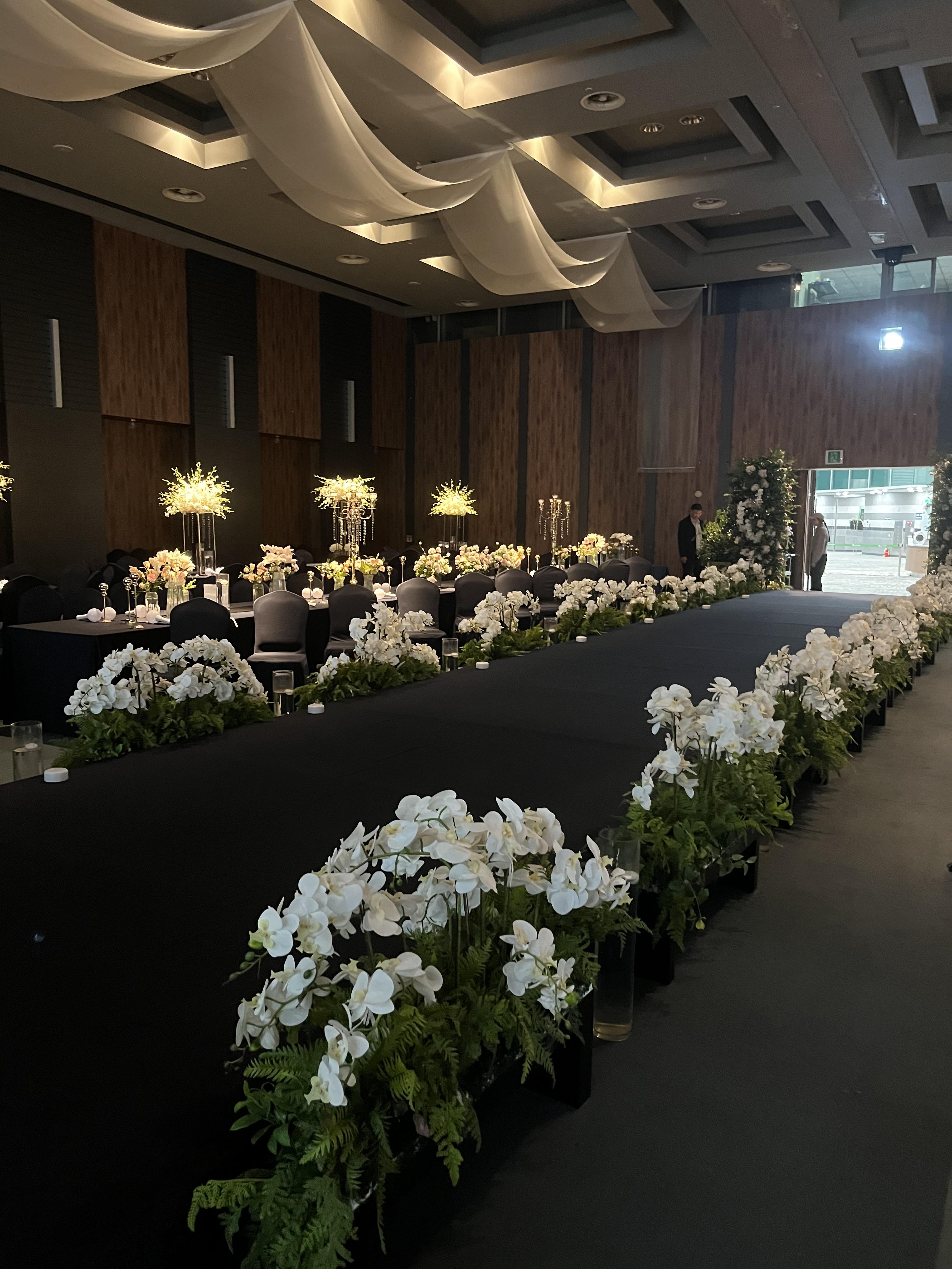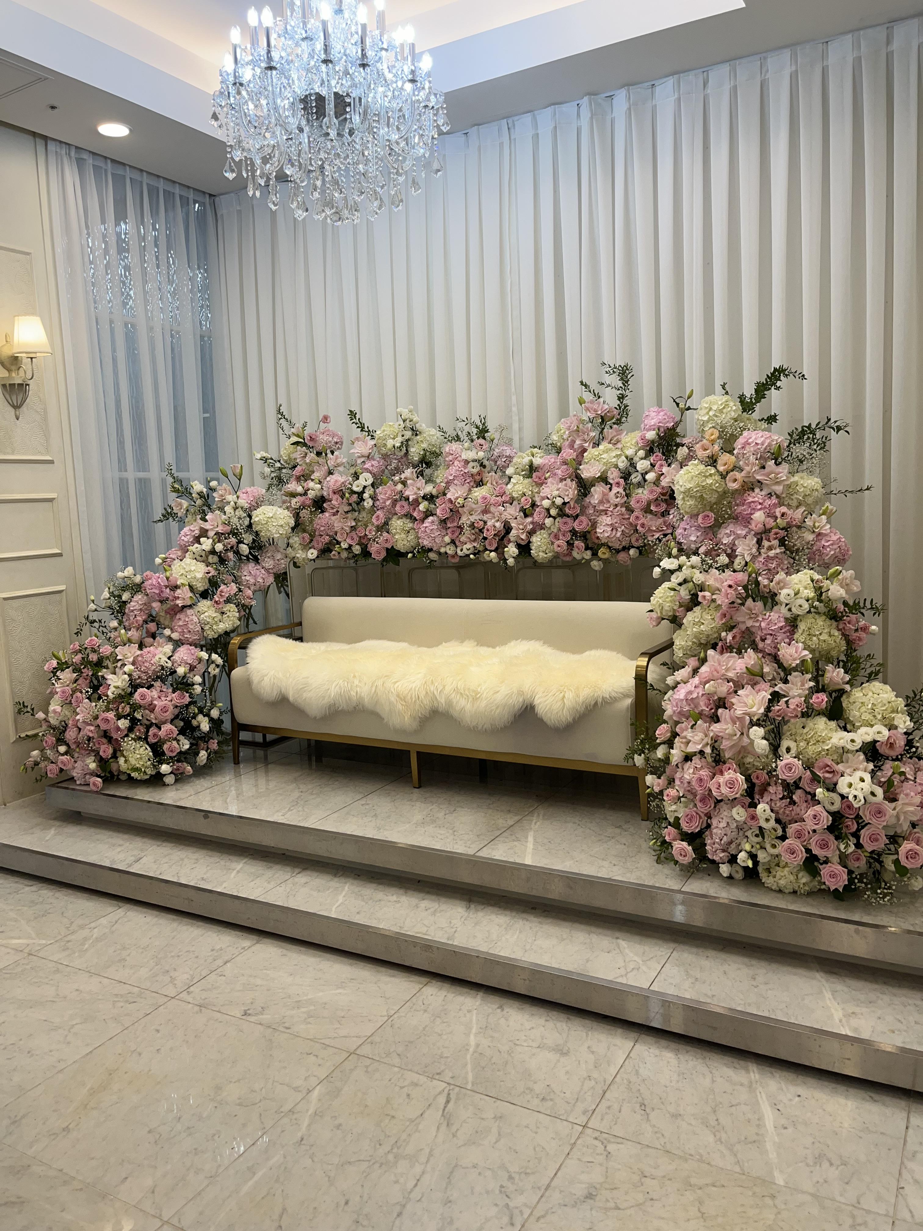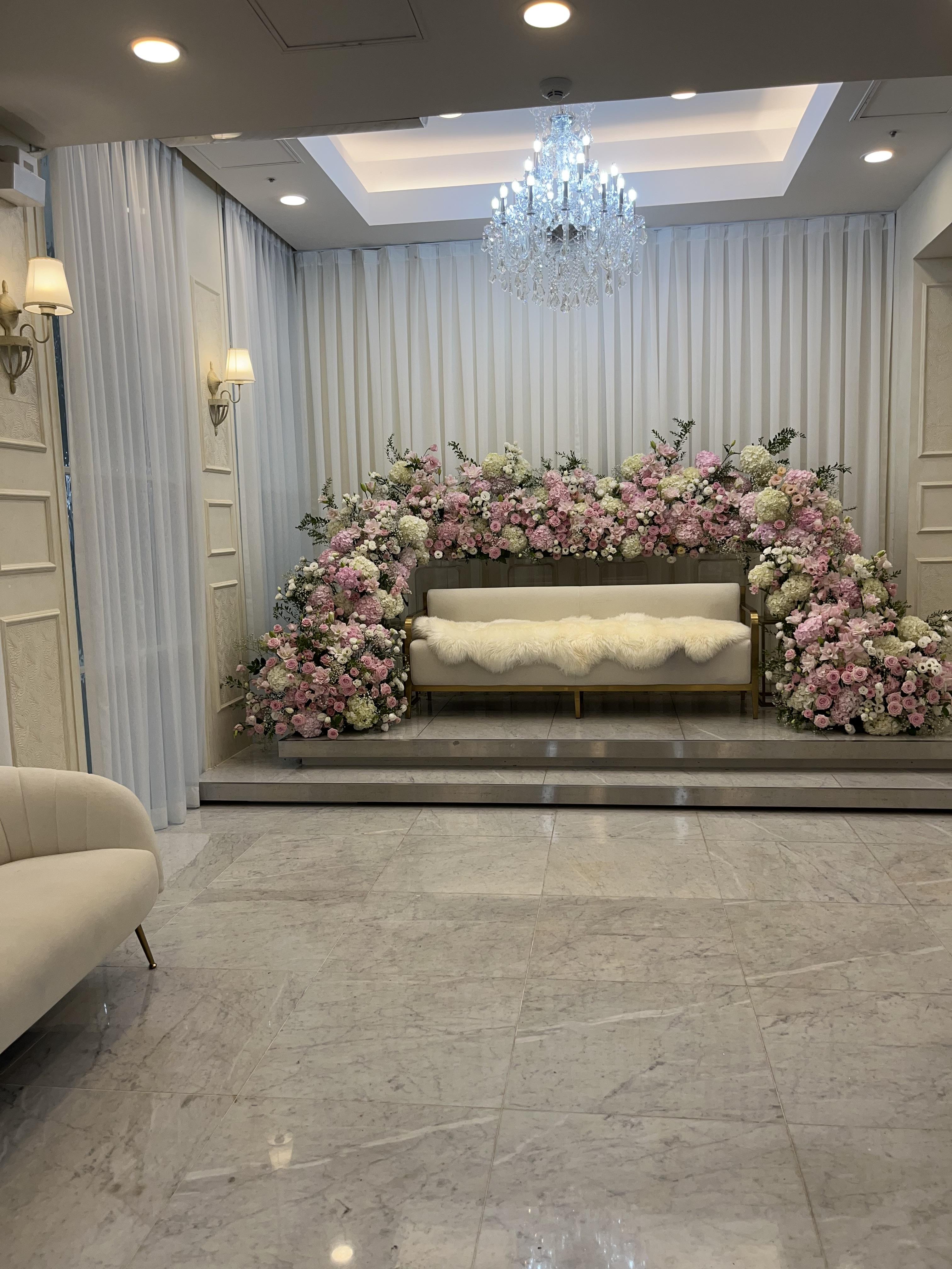 웨딩홀 안쪽도 생화를 많이 배치하여 화려한 분위기를 더해주었고 20M가 넘는 버진로드와 200석의 웨딩홀은 웅장한 느낌이다.