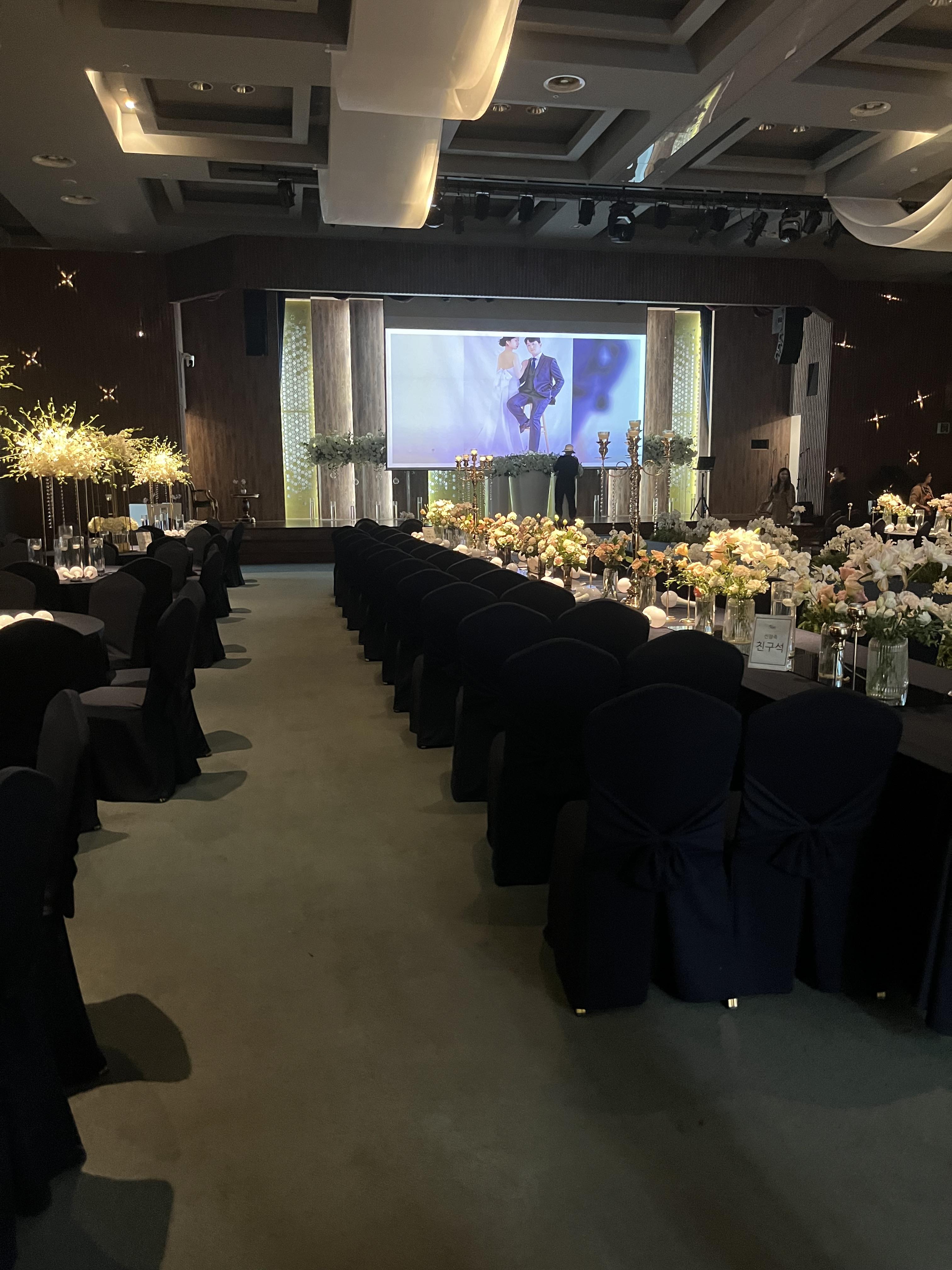 웨딩 연출을 위한 조명, 영상등이 화려한 편이고 연회장에서 예식을 생중계하여 식사를 하면서 예식을 볼수 있다.