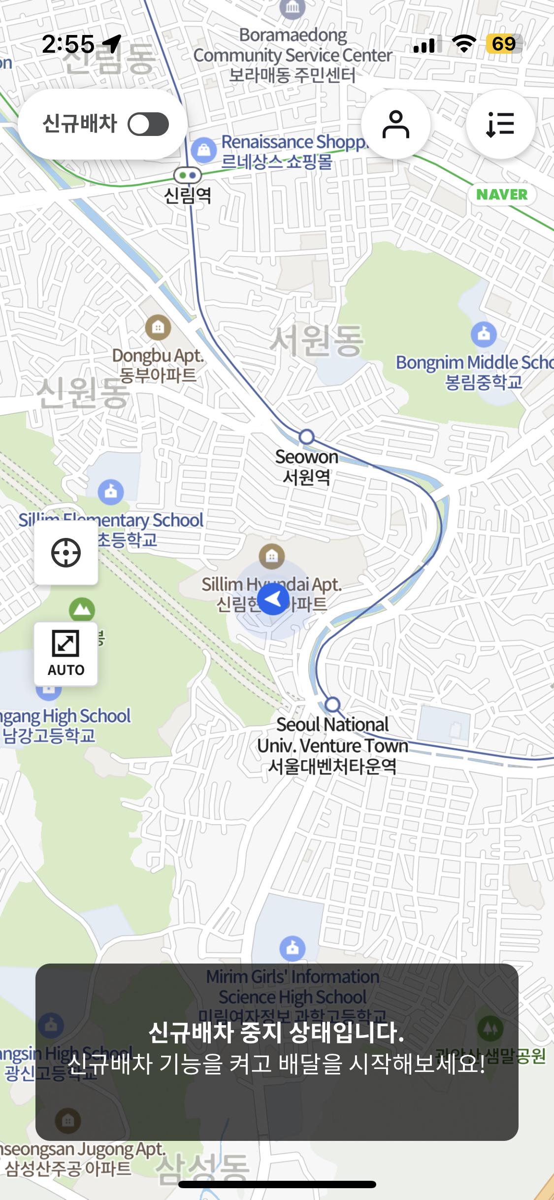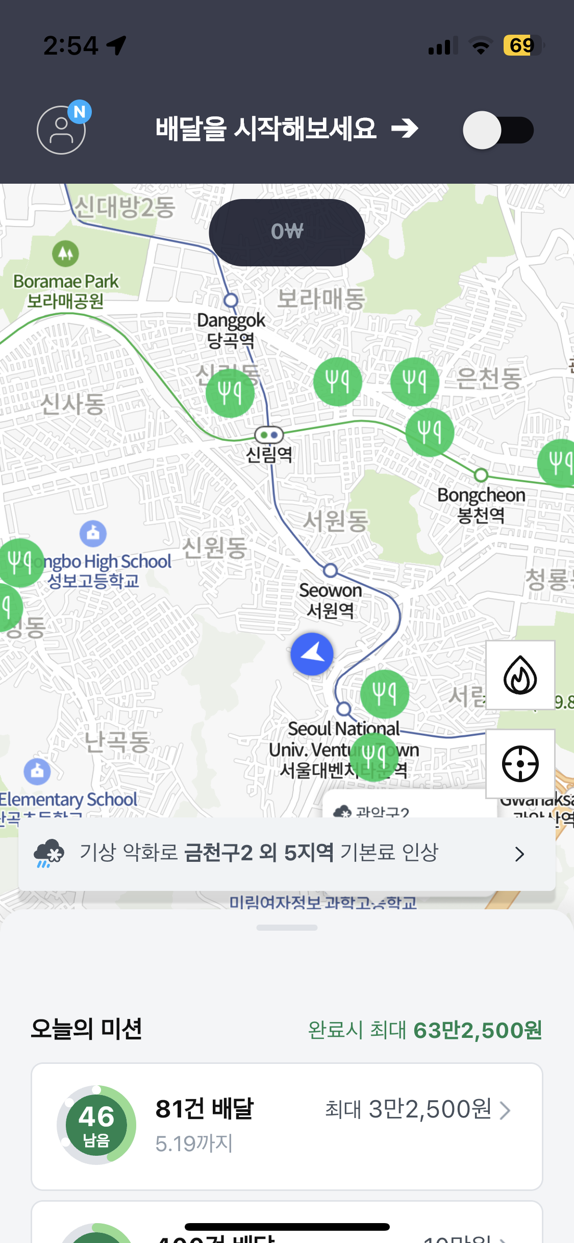 오른쪽 위쪽의 버튼을 스크롤 하면 배달일을 시작할 수 있고 자동으로 배차가 되어 배차를 수락할 시에 배달을 시작할 수 있게 된다.