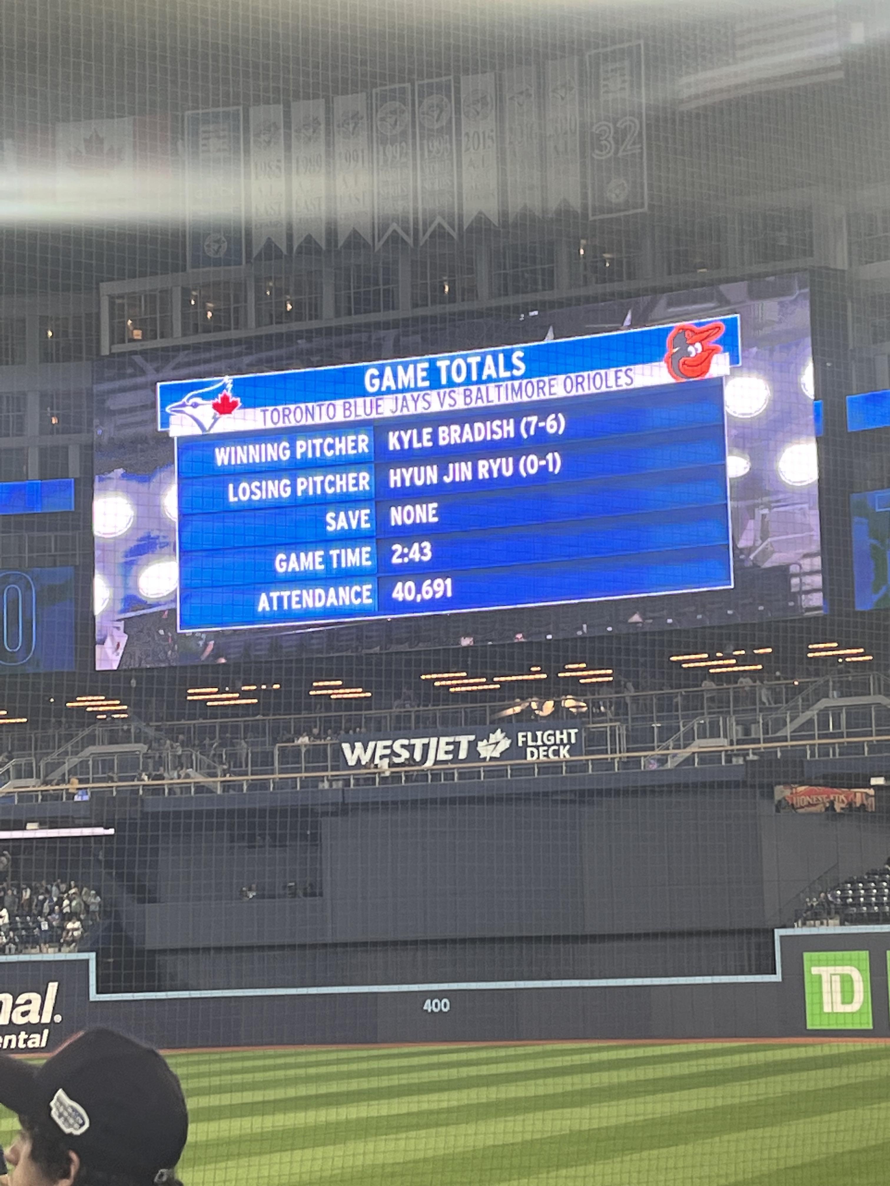 로저스센터는 돔구장이기도 하지만 필요에 따라서 지붕을 열고 닫을 수 있다. 비가 오는 날은 비 맞을 걱정을 하지 않아도 되고 날이 좋은 날은 지붕을 열어두기도 하는데 이날은 경기시작 전에는 닫혀있던 지붕이 경기시작 후에 열어주었다.