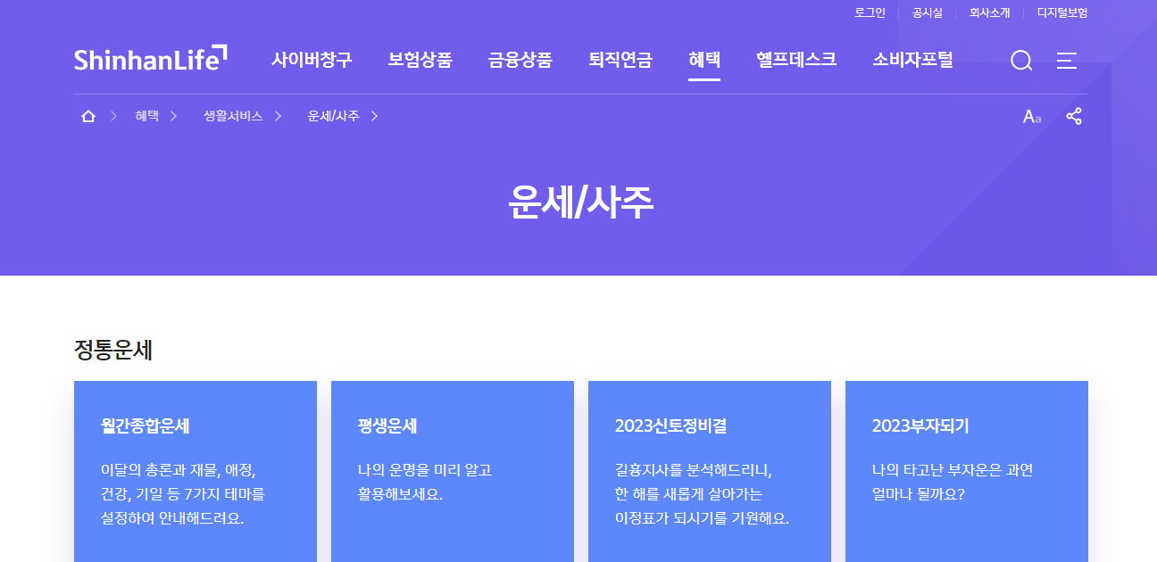 신한라이프 운세에서는 무료로 신년운세, 평생운세, 생활운세, 배우자 궁합 등 다양한 운세들을 제공하고 있습니다.