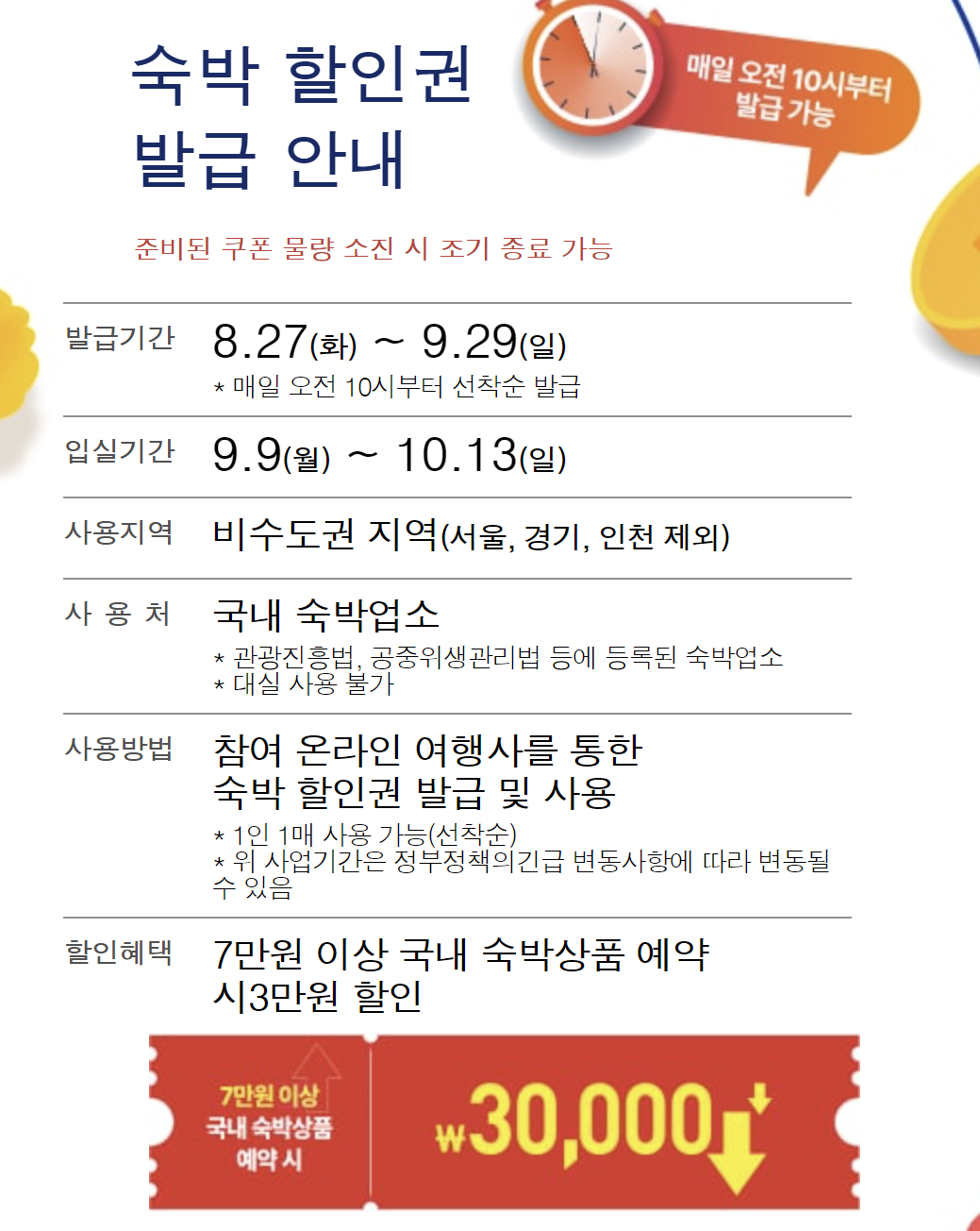 숙박할인권은 27일 오전 10시부터 이번 행사에 참여하는 온라인여행사 채널을 통해 1인 1매 선착순으로 발급하며 준비된 수량이 모두 소진되면 발급이 종료됩니다.