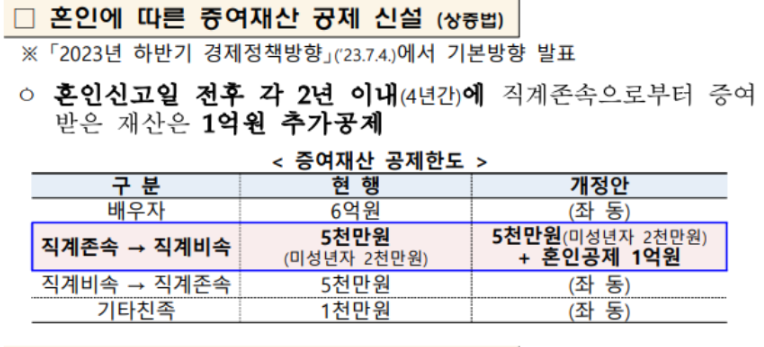 신혼부부가 부모, 조부모 등 직계존속으로부터 증여세 없이 각각 1억을 추가로 공제받을수 있게 됩니다.